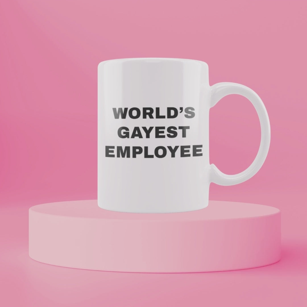 If you’re a gay, this mug’s for you. Whether you’re at the office, over Zoom, or working from home with your cat—celebrate your gayness with a “World’s Gayest Employee” coffee mug.